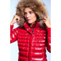 Plumífero largo de mujer “First Class” de corte slim fit. Cierre central con cremallera personalizada de doble carro. Capucha desmontable con pelo natural desmontable. Acolchado lateral en forma de “V” para mejor ajustado de la prenda. Tejido repelente al agua y cortavientos. Relleno de plumón termorregulador. Largo: 86cm.
