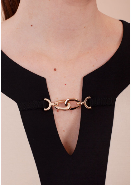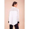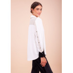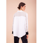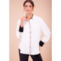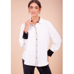 Blusa blanca de mangas largas, con cuello, puños y parte de la tapeta de botones en negro. Los bordes de la tapeta y los puños tienen detalles en gris claro. La blusa se abrocha con botones, perfecta para un look cómodo y con estilo.