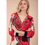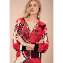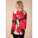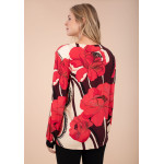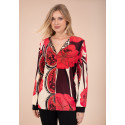 Blusa multicolor de manga larga. Escote en pico con detalle de estampado animal print en el cuello. Estampado floral y geométrico en tonos rojos, beige y burdeos. Puños de canalé negro.