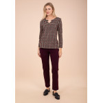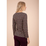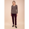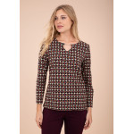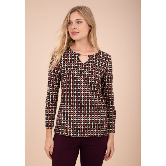 Camiseta de punto con estampado geométrico en negro y rojo, escote en uve con cadenita.