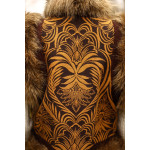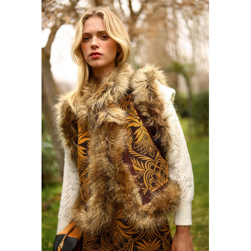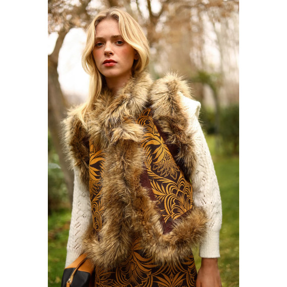 El   chaleco  Bea  es una pieza reversible de inspiración folk, confeccionada con tejidos de motivos clásicos y rematada con un borde de pelo que aporta calidez y dramatismo visual. Su diseño artesanal y su versatilidad lo convierten en un imprescindible para looks otoñales o de entretiempo, ideal para llevar dos looks en uno y superponer sobre prendas de punto o camisas estructuradas, creando un contraste entre tradición y modernidad.