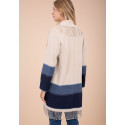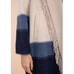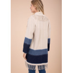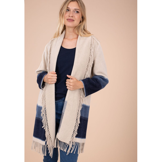 La chaqueta se caracteriza por un amplio fleco en todo el contorno, tanto en los laterales como en el bajo. Tiene un corte abierto, sin cierre, y un cuello tipo chal. Las mangas son largas y también presentan el mismo diseño a rayas. El tejido parece suave y cálido, ideal para la temporada de otoño/invierno.