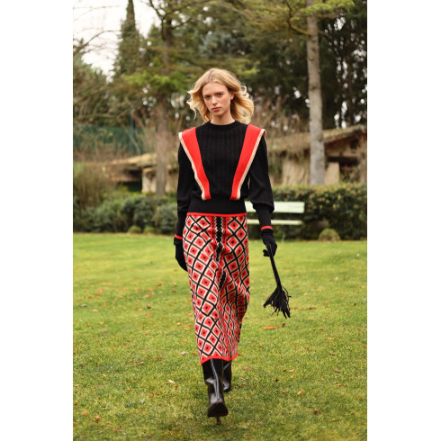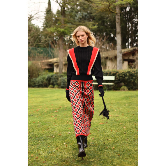 El jersey Anna combina elegancia atemporal con un aire relajado y moderno. Confeccionado en un tejido suave y cálido, destaca por su diseño único: una base negra con detalles en verde y beige que caen en forma de "V" sobre los hombros, aportando un toque visual sofisticado y original. Su corte ligeramente holgado lo hace ideal para un estilo cómodo pero pulido. Versátil y chic, el jersey Anna se puede combinar con su falda a juego para un look coordinado perfecto, o llevar con pantalones o incluso sobre un vestido para darle un giro moderno. Composición: 10% Lana, 5% Alpaca, 10% Viscosa, 75% F. Poliacrílica.