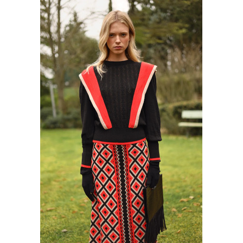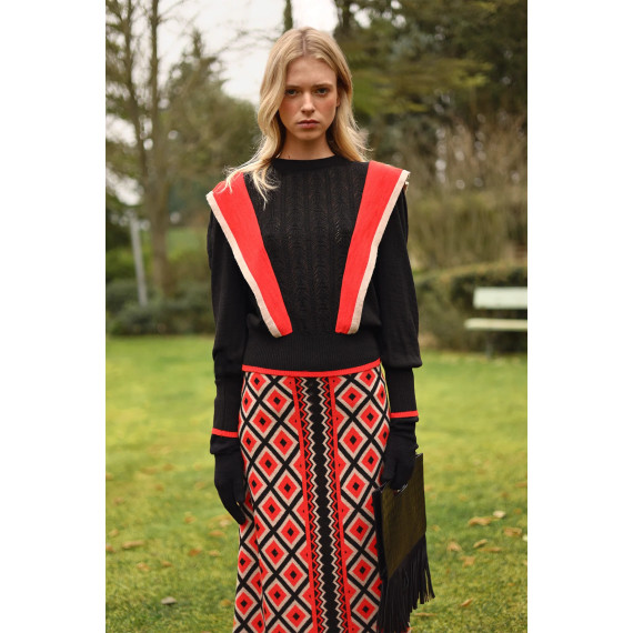 El jersey Anna combina elegancia atemporal con un aire relajado y moderno. Confeccionado en un tejido suave y cálido, destaca por su diseño único: una base negra con detalles en verde y beige que caen en forma de "V" sobre los hombros, aportando un toque visual sofisticado y original. Su corte ligeramente holgado lo hace ideal para un estilo cómodo pero pulido. Versátil y chic, el jersey Anna se puede combinar con su falda a juego para un look coordinado perfecto, o llevar con pantalones o incluso sobre un vestido para darle un giro moderno. Composición: 10% Lana, 5% Alpaca, 10% Viscosa, 75% F. Poliacrílica.