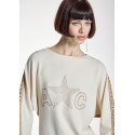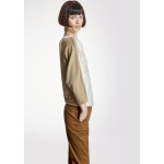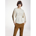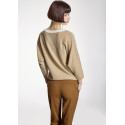 Jersey bicolor crudo y camel con bonitas letras de lentejuelas .Las tachas en las mangas de dan a la prenda un aire moderno y único.