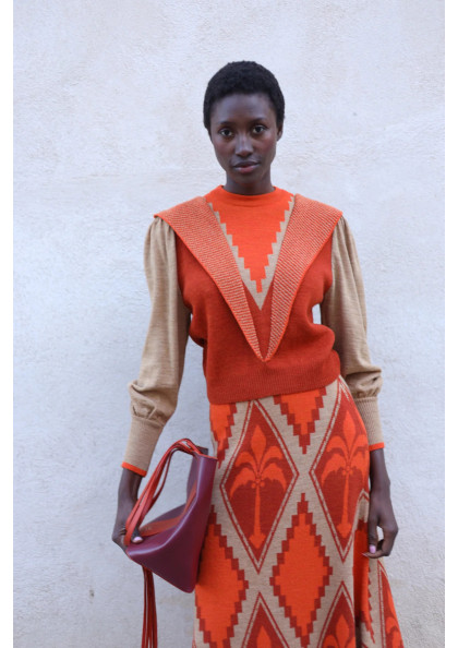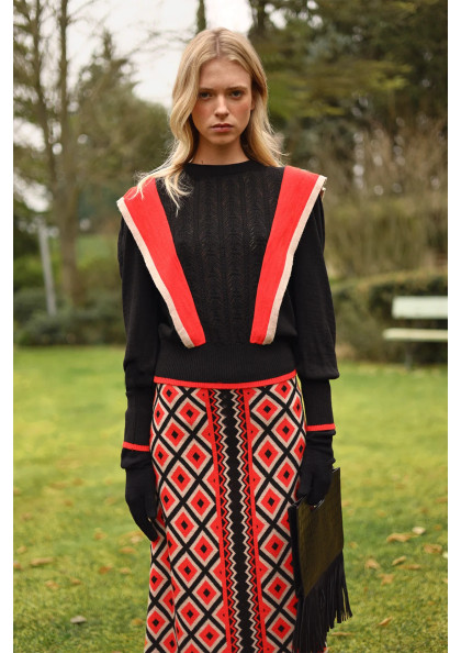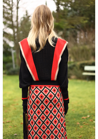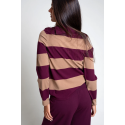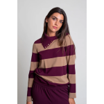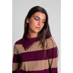 Jersey de punto tricot con rayas anchas bicolor. Modelo de corte recto con manga larga y falso cuello vuelto con adorno de botones metálicos.