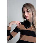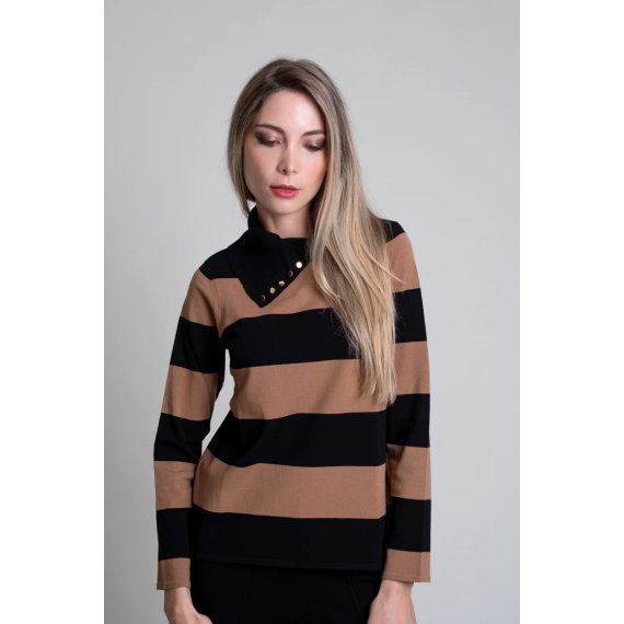 Jersey de punto tricot con rayas anchas bicolor. Modelo de corte recto con manga larga y falso cuello vuelto con adorno de botones metálicos.