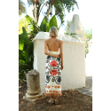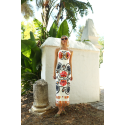 El vestido Orinoco seduce por su estampado vibrante e inolvidable. Su escote en la espalda de finas tiras cruzadas lo convierte en una pieza sensual y perfecta para lucir piel. Su acabado en fornitura de flecos de colores le da el toque final de alegría y dinamismo, convirtiéndolo en una pieza que realza la belleza natural del verano. Cierre con cremallera invisible lateral.