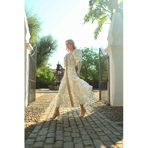 Una camisa con mangas abullonadas que añaden volumen y sofisticación. Cuenta con un delicado diseño bordado en tonos neutros y detalles de chorrera en la parte frontal. PARA TALLAJE PONERSE EN CONTACTO CON TIENDA  941145881