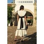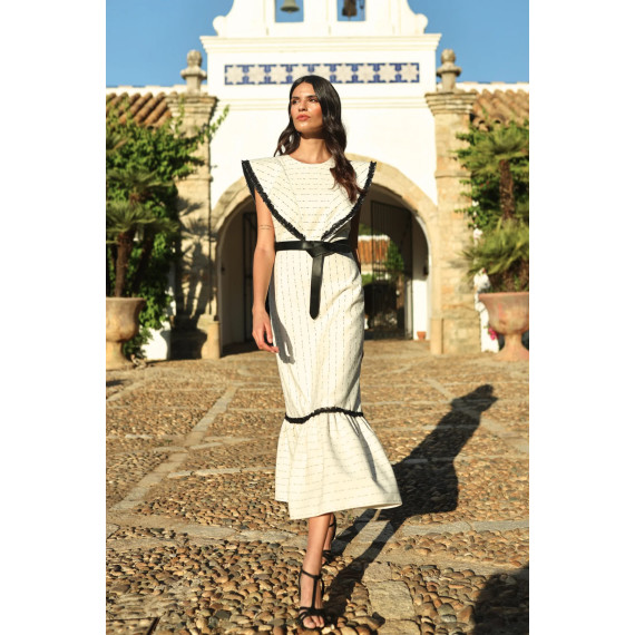 Vestido que combina la sofisticación de los detalles de flecos en contraste con un diseño minimalista a rayas. Escote a la caja, nuestro ya clásico alerón que tanto estiliza la zona del escote y falda con vuelo ligeros.