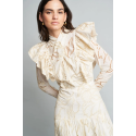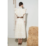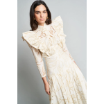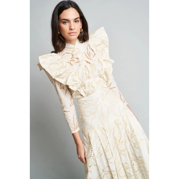 Vestido en tejido bordado calado con un delicado diseño floral que aporta textura.. Destaca por su cuello cerrado y volantes estructurados en hombros y pecho que realzan la silueta.